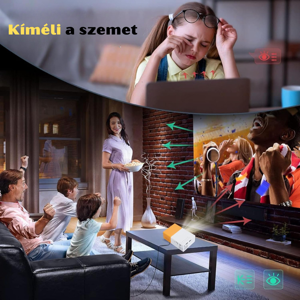 Mini LED projektor nabízí rozlišení 1920x1080P Full HD a poskytuje dynamický a barevný obraz, vhodný pro použití v interiéru i exteriéru. Je vybaven několika porty, včetně HDMI, USB, AV, sluchátek a TF karty, a je kompatibilní s notebooky, počítači, TV sticky, tablety a chytrými telefony. Vestavěné HIFI stereo reproduktory s nízkou hladinou hluku a inteligentním odvodem tepla zajišťují čistý zvuk bez potřeby externích reproduktorů. Ideální pro rodinná setkání, kempování a vzdělávací účely. Díky jemnému světlu je možné pohodlně sledovat videa, fotografie, prezentace, sportovní přenosy a hry, aniž by bylo ohroženo zrak dětí. Přenosný design umožňuje napájení nebo nabíjení přes nabíječku telefonu, autoadaptér nebo micro USB port, takže filmy a hry si můžete užít kdekoli – doma, venku, na cestách nebo při kempování.