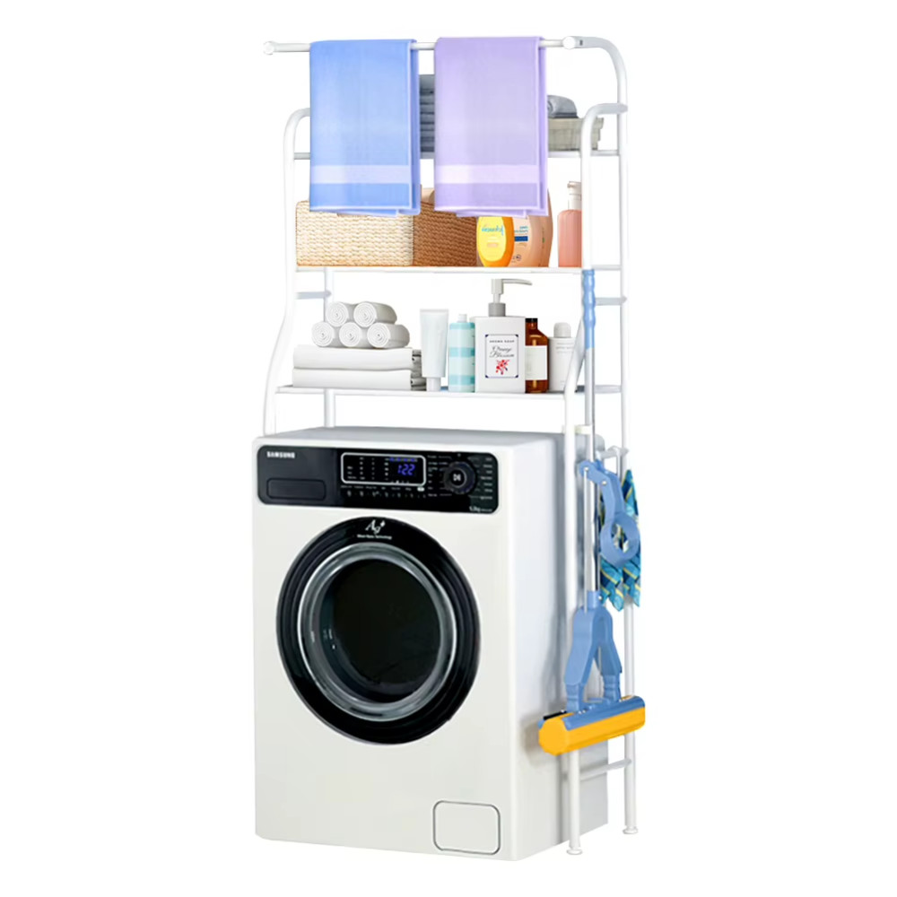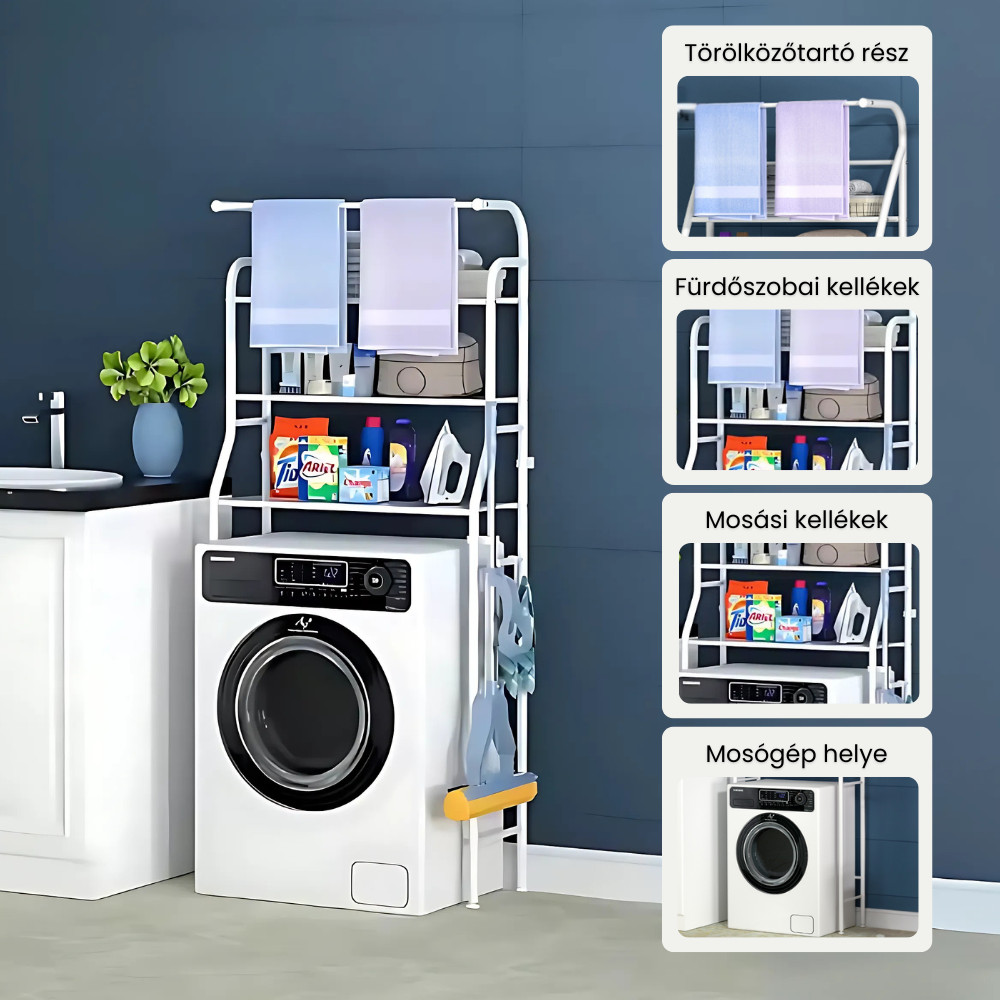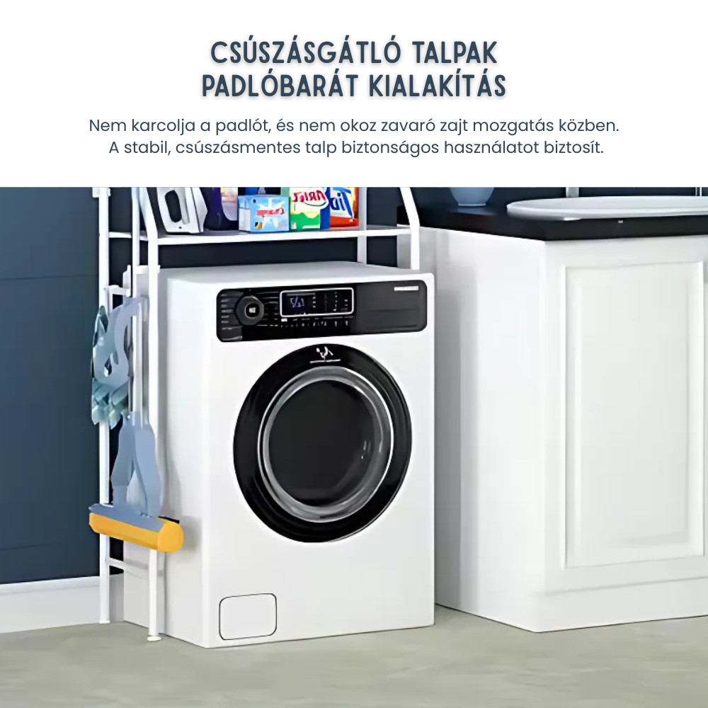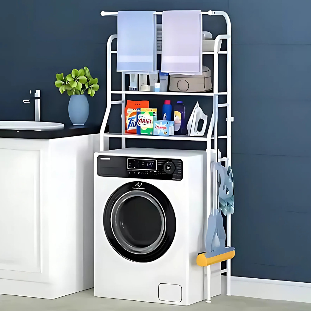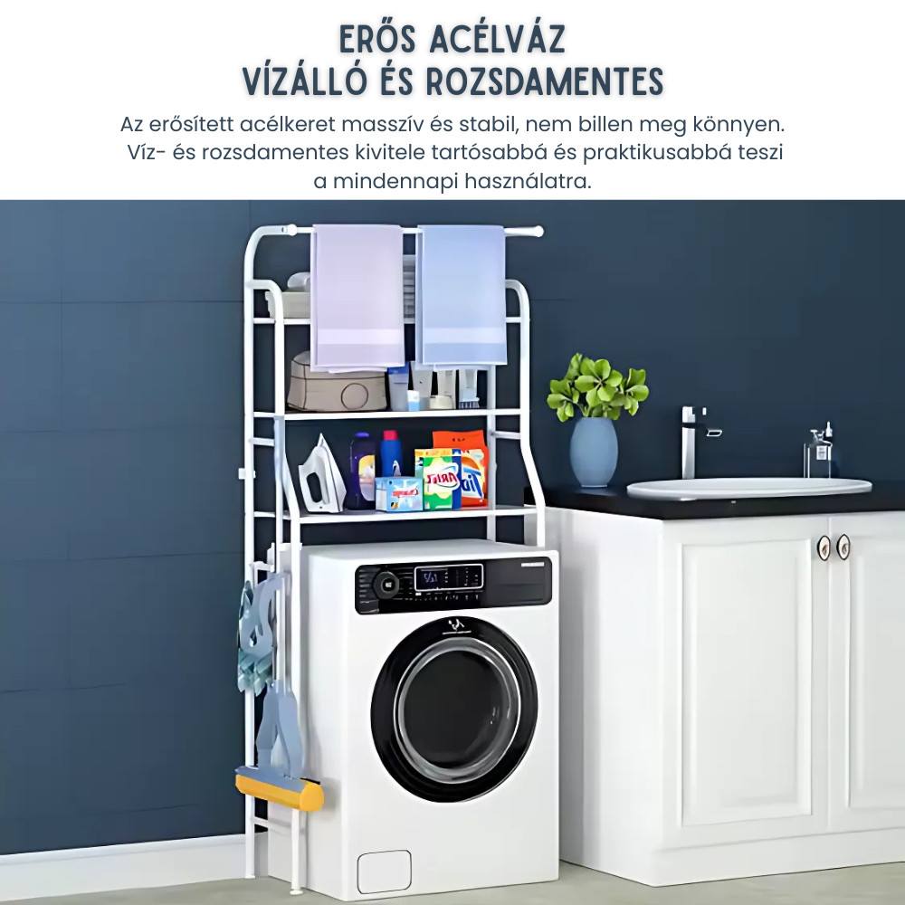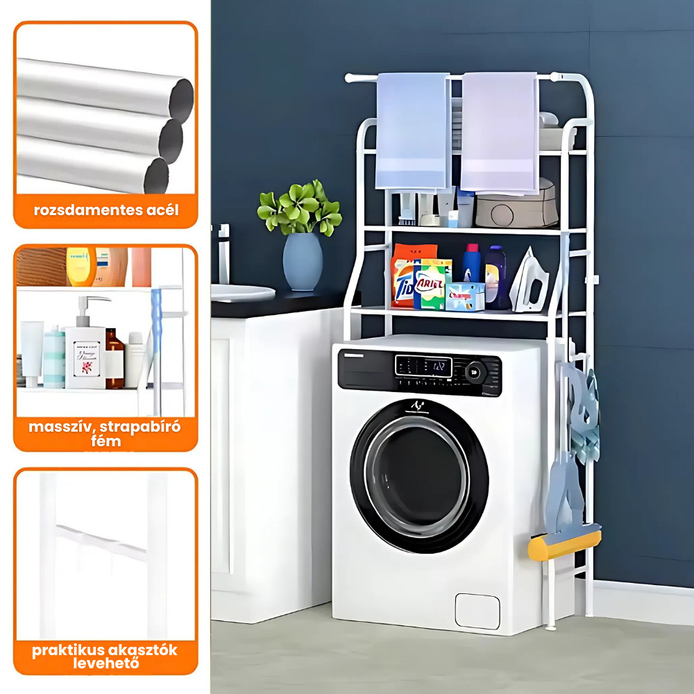 Eliberează spațiul valoros din baie sau din camera de spălat cu această etajeră practică cu 3 niveluri din oțel inoxidabil! Se montează ușor, fără găurire, este stabilă și perfectă pentru organizarea eficientă deasupra mașinii de spălat – o soluție ideală pentru orice locuință.