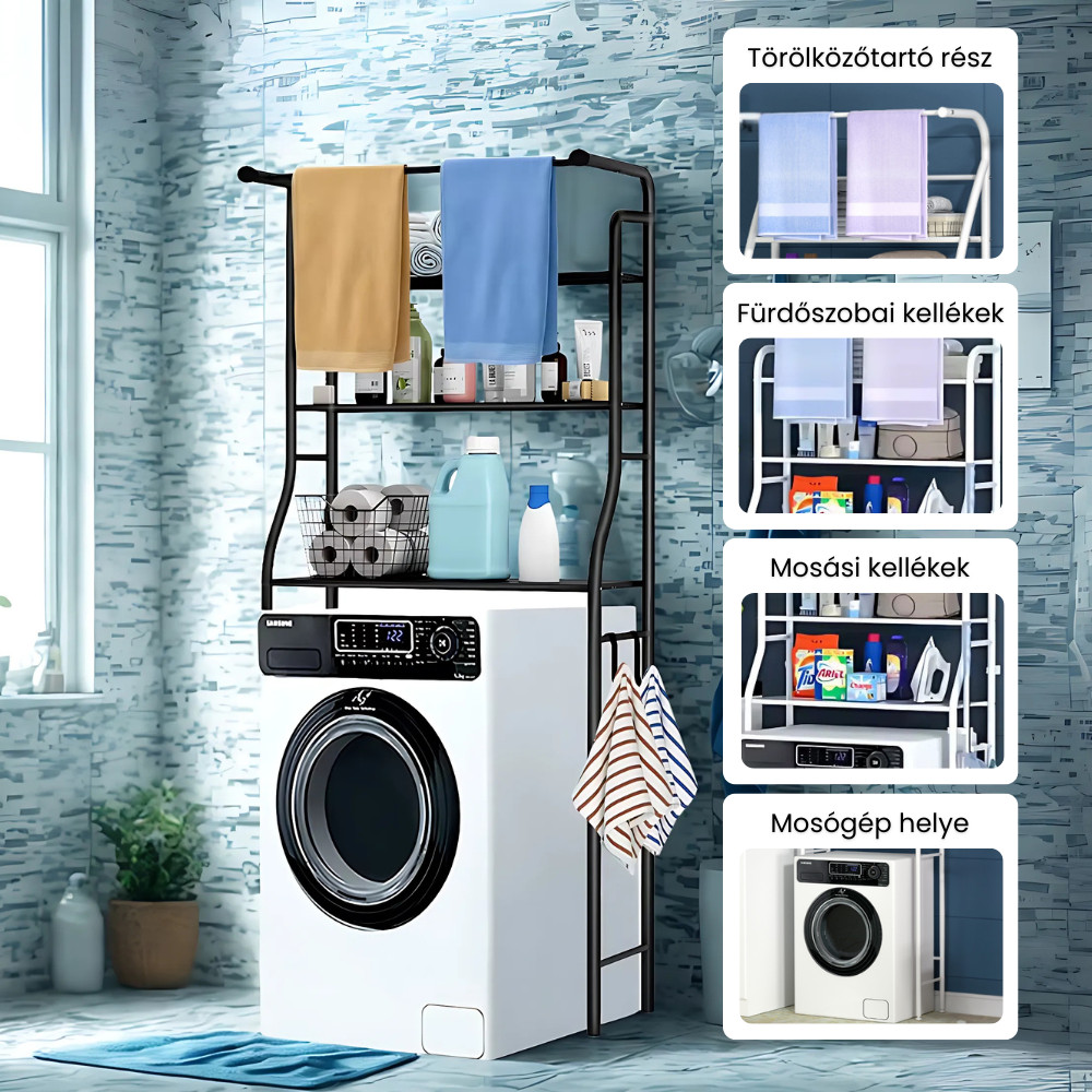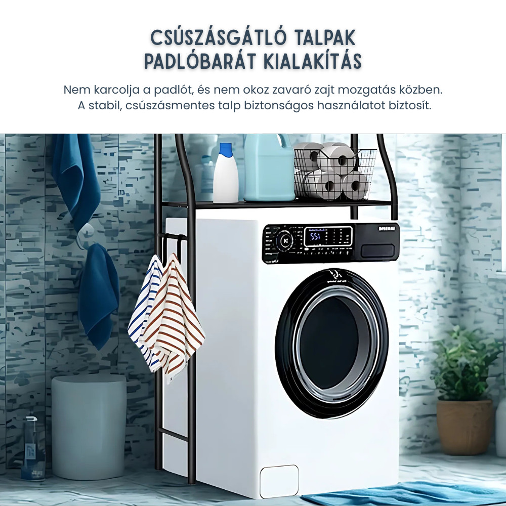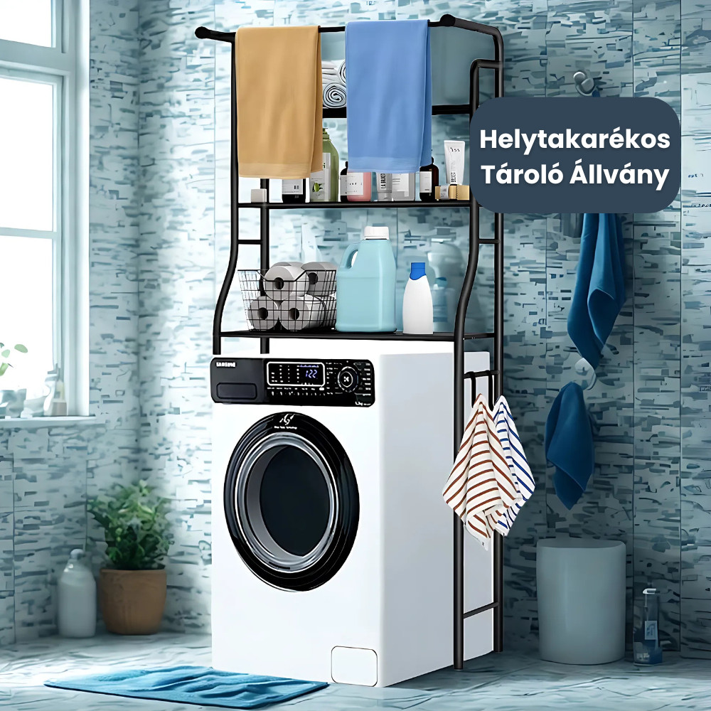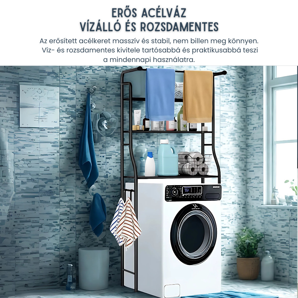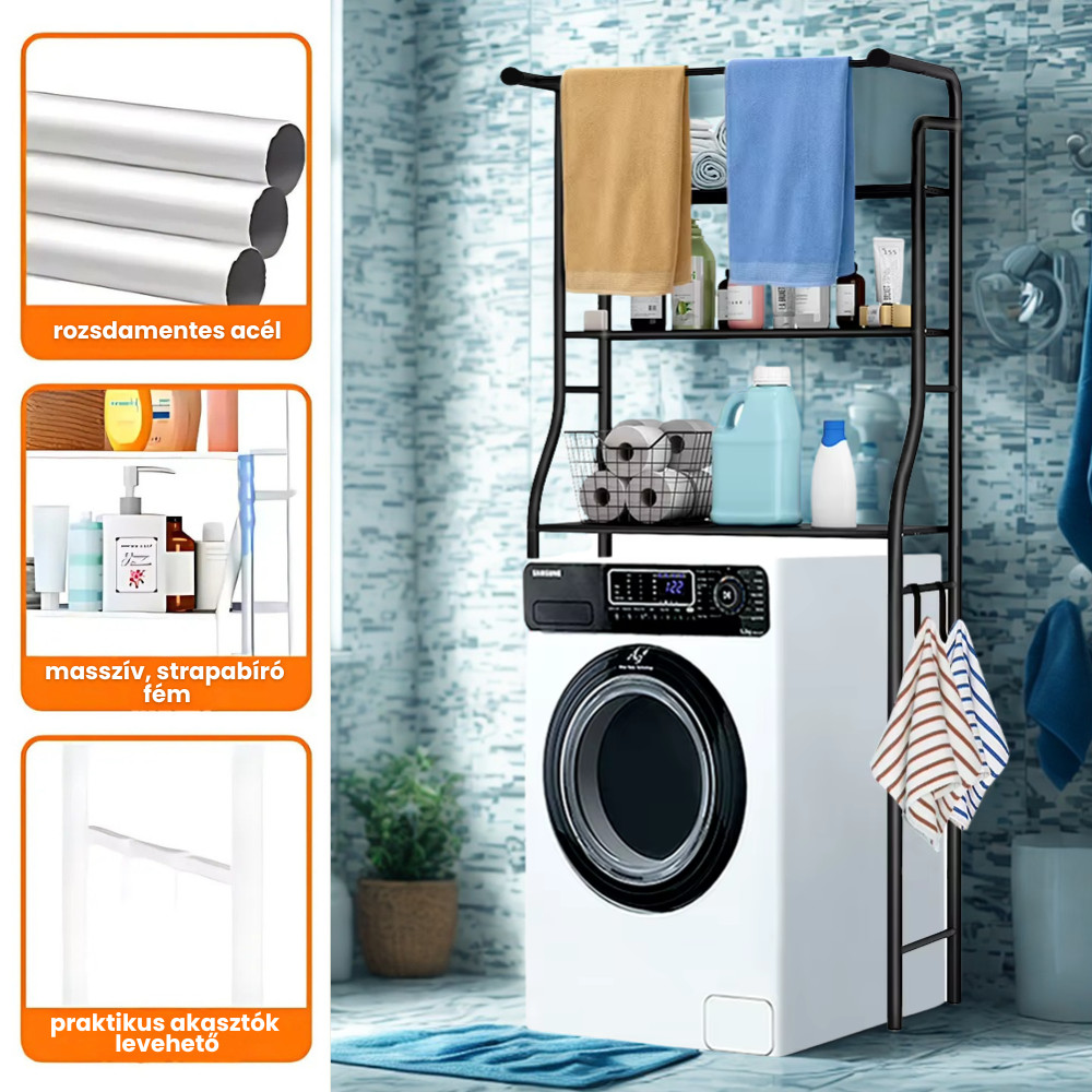 Eliberează spațiul valoros din baie sau din camera de spălat cu această etajeră practică cu 3 niveluri din oțel inoxidabil! Se montează ușor, fără găurire, este stabilă și perfectă pentru organizarea eficientă deasupra mașinii de spălat – o soluție ideală pentru orice locuință.
