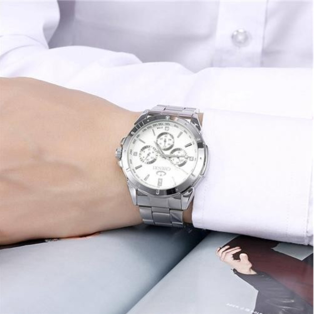 Elegáns férfi karóra, precíz quartz szerkezettel, ezüst színben. Modern dizájn, könnyen kombinálható mindennapi és alkalmi viselethez. Díszdobozban szállítva, ideális ajándéknak.